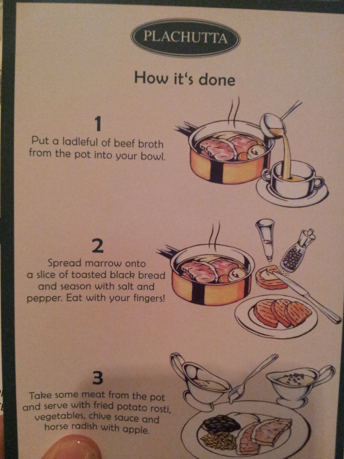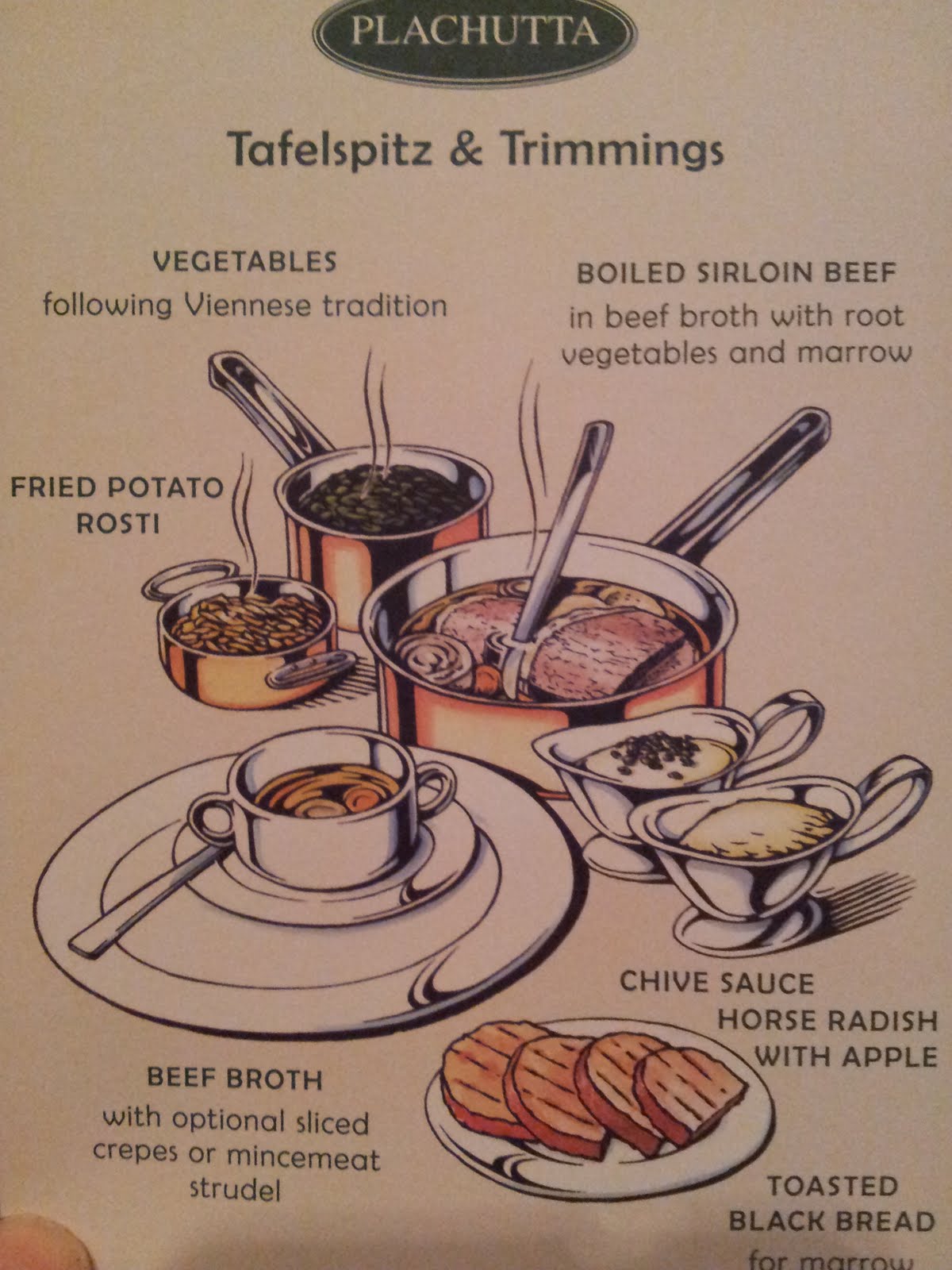 טאפלשפיץ (Tafelspitz): מאכל מסורתי אוסטרי, אולי אפילו יותר מהשניצל, אם כי פחות עממי ממנו. בערב הראשון שלנו ישו ואיבי (ע"ע) לקח אותנו למסעדה שמתמחה בטאפלשפיץ. בתכל'ס, זה מרק בשר (כמו מרק עוף אבל מבשר) עם בשר מכובס בפנים. אבל איזה מעדן! המרק מרוכז ועשיר בטעם, ומי שרוצה יכול להוסיף לו איטריות, רצועות פנקייק או שטרודל בשר. ליד הבשר (שהתבשל שעות בסיר) מקבלים לחם, תרד מאודה, רושטי של תפוחי אדמה ומח עצם (בלי העצם!). מבולבלים? גם אנחנו. בשביל זה בתפריט יש הסבר מפורט איך לאכול את המנה. וככה זה נראה: