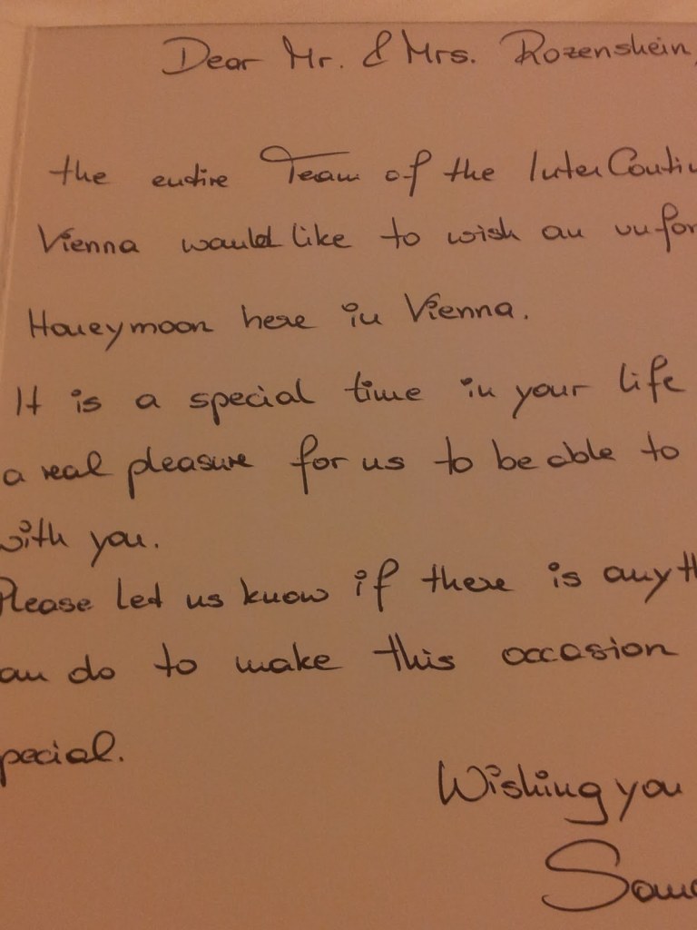 זה עוד מילא, אבל כשמנהל השירות במלון טרח וכתב לנו מכתב בכתב ידו שבו הוא מאחל לנו שפע שנים של זוגיות מאושרת בתחילת חיינו המשותפים, ומסביר לנו כמה זו תקופה מיוחדת בחיינו – זה כבר היה לא נעים ממש.