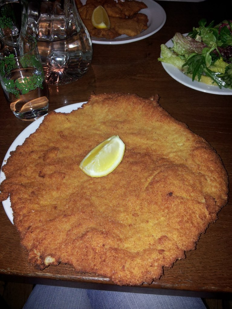 שניצל: עוד מאכל אוסטרי מסורתי. המקום הטוב ביותר, לדברי המארחים שלנו, לאכול בו שניצל הוא במסעדה בשם Figlmuller. זו מסעדה שיש לה כמה סניפים והיא לא רומנטית או מיוחדת, אבל היא נחשבת למקום שעושה שניצל עגל מצוין. אין שם בירה או משקאות קלים (רק מים או יין), אין שם צ'יפס או פירה (רק סלט ירוק וסלט תפוחי אדמה) ואין קינוח. רק שניצל עצום, בגודל של צלחת , שעשוי מ-250 ג' של בשר עגל.