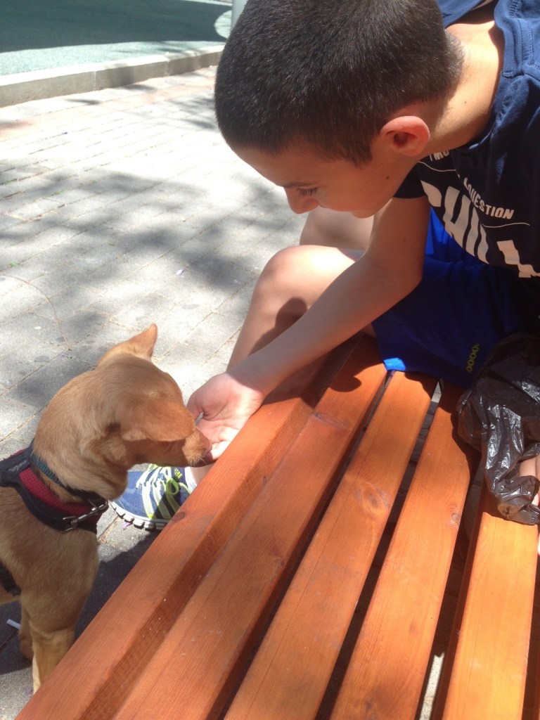 אז אחרי שנרשמנו (בגלל שאיתמר בן פחות מ-14 ההתנדבות חייבת להיות בליווי הורה) קיבלנו את סוקי – כלבה מתוקה בת שנה. הוצאנו אותה לטיול בסביבה והיא הייתה מאוד חברותית. באופן מפתיע היא לא הייתה מפוחדת ולא באטרף לרוץ או לאכול. קיבלנו מהאחראי מלא הנחיות – לא להיכנס לקניון, לא להיכנס לחצרות של בניינים, לא להתקרב לאנשים או לכלבים אחרים – וכך הבנו שיש להם שם בעיה עם השכנים שמאוד לא אוהבים שיש לידם מכלאה של חיות עזובות. אז התרחקנו לגן ציבורי סמוך ואיתמר נתן לה חטיפים והריץ אותה.