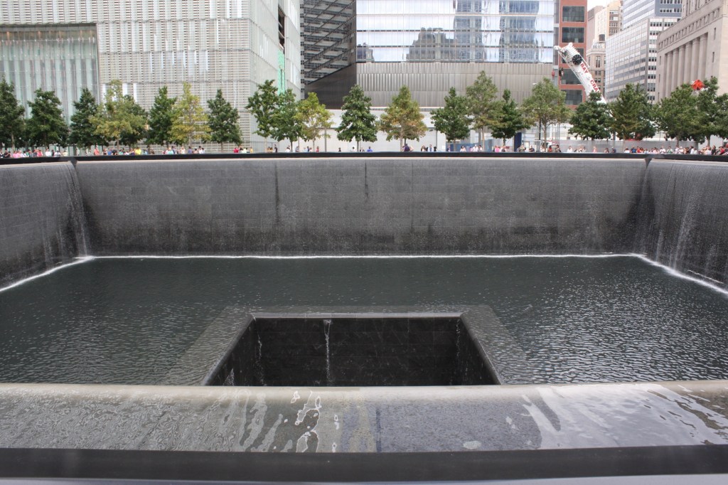 אחרי השיט הלכנו ברגל לגראונד זירו, לראות את הבריכות ואת המוזיאון החדש שנפתח לפני שנה בדיוק. התאריך היה 12/9 – יום אחרי יום השנה ה-14 לפיגוע בתאומים – והיו המון המון אנשים (יום קודם היה סגור בגלל טקסי הזכרון הרשמיים). שתי הבריכות המרובעות, שהוקמו בדיוק במקום שבו ניצבו המגדלים, נחפרו לעומק ומפלי המים זורמים בהן ברעש אדיר שאולי מדמה את נפילתם. מסביב לכל בריכה חקוקים שמות האנשים שנהרגו בכל אחד מהבניינים, והאפקט הכללי מאוד מאוד מרשים.