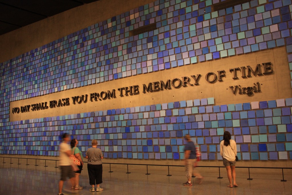 הסבר הצילום: 2,996 תושבי ניו יורק, כמספר הנספים, התבקשו לשחזר מה היה צבע השמים ביום שבו התרחש האסון. מהריבועים, שכל אחד צבוע בגוון אחר של כחול, עשו קולאז' יפהפה, והוסיפו את הכיתוב הזה, שאותיות המתכת שלו עשויות מהשרידים של הבניינים. מאחורי הקיר שעליו ניצב הקולאז' יש מיכל ענק שבו נשמרים יותר מ-9000 חלקי גופות – עצמות ורקמות – שלא זוהו. הכוונה לשמור את חלקי הגופות בתוך המוזיאון (אין לשם גישה, רק שלט בקיר) הכעיסה מאוד כמה מהמשפחות של הנספים שחשבו שזה לא מכובד ויצרה חיכוך צורם.