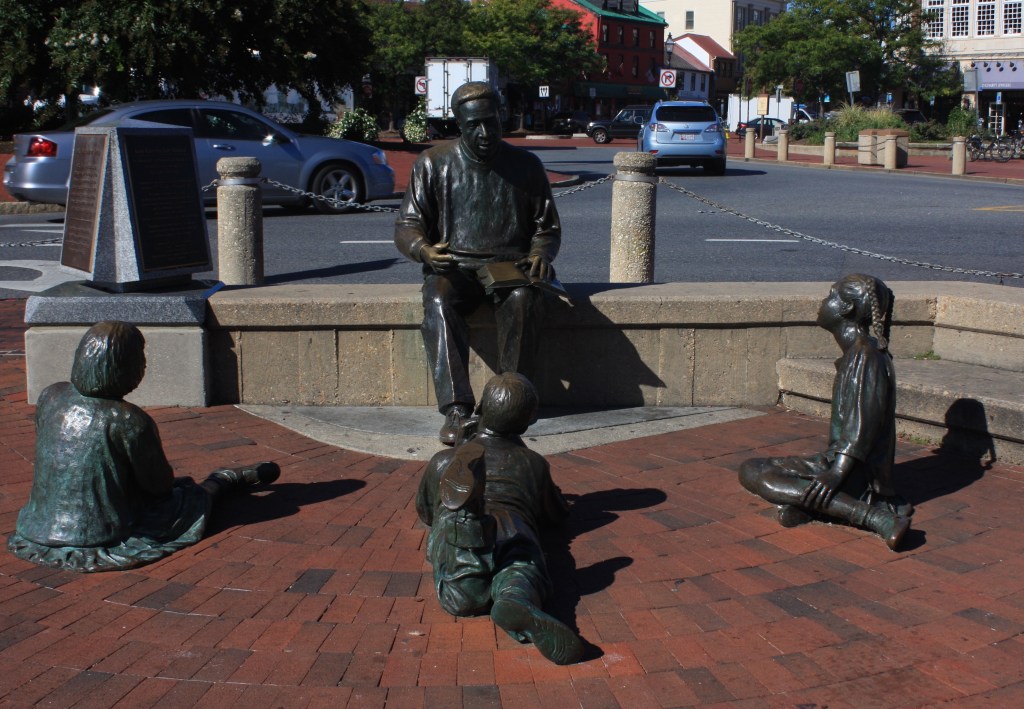 נכנסנו ל-state house של מרילנד (משהו כמו הכנסת שלהם), שהוא בית המדינה העתיק ביותר בארה"ב שהיה פעיל ברציפות מאז הוקם ב-1772, ראינו שיחזור של אולם האסיפה המחוקקת שבו ג'ורג' וושינגטון התפטר מתפקיד מפקד הצבא ב-1783, ועשינו סלפי עם פסל של וושינגטון. משם המשכנו לכיוון המרינה, שם ניצב פסל מפורסם של אלכס היילי, מחבר הספר "שורשים" (כן, ההוא מקונטה קינטה), ואלון והילדים החליטו לעשות לו שיחזור:
