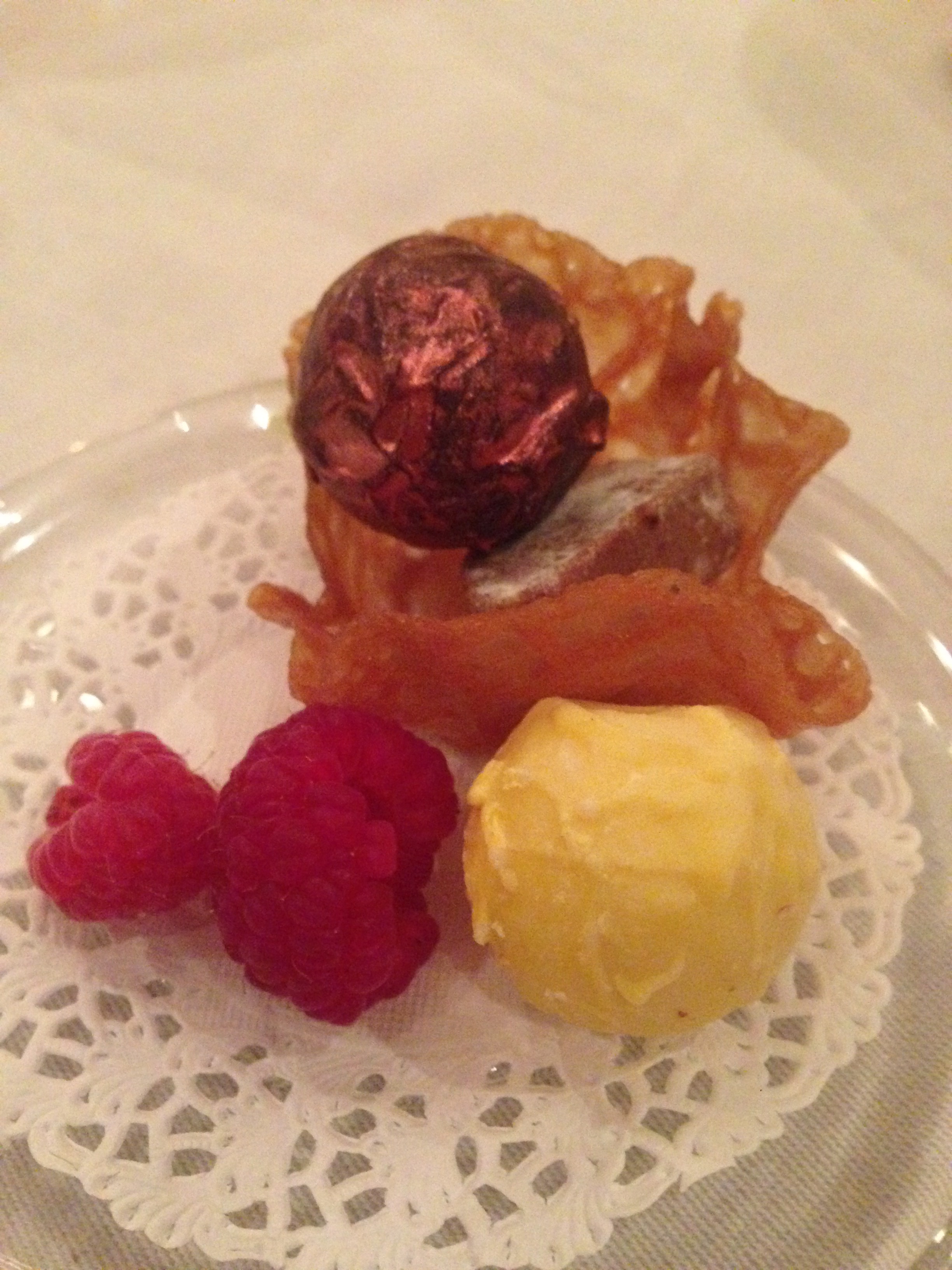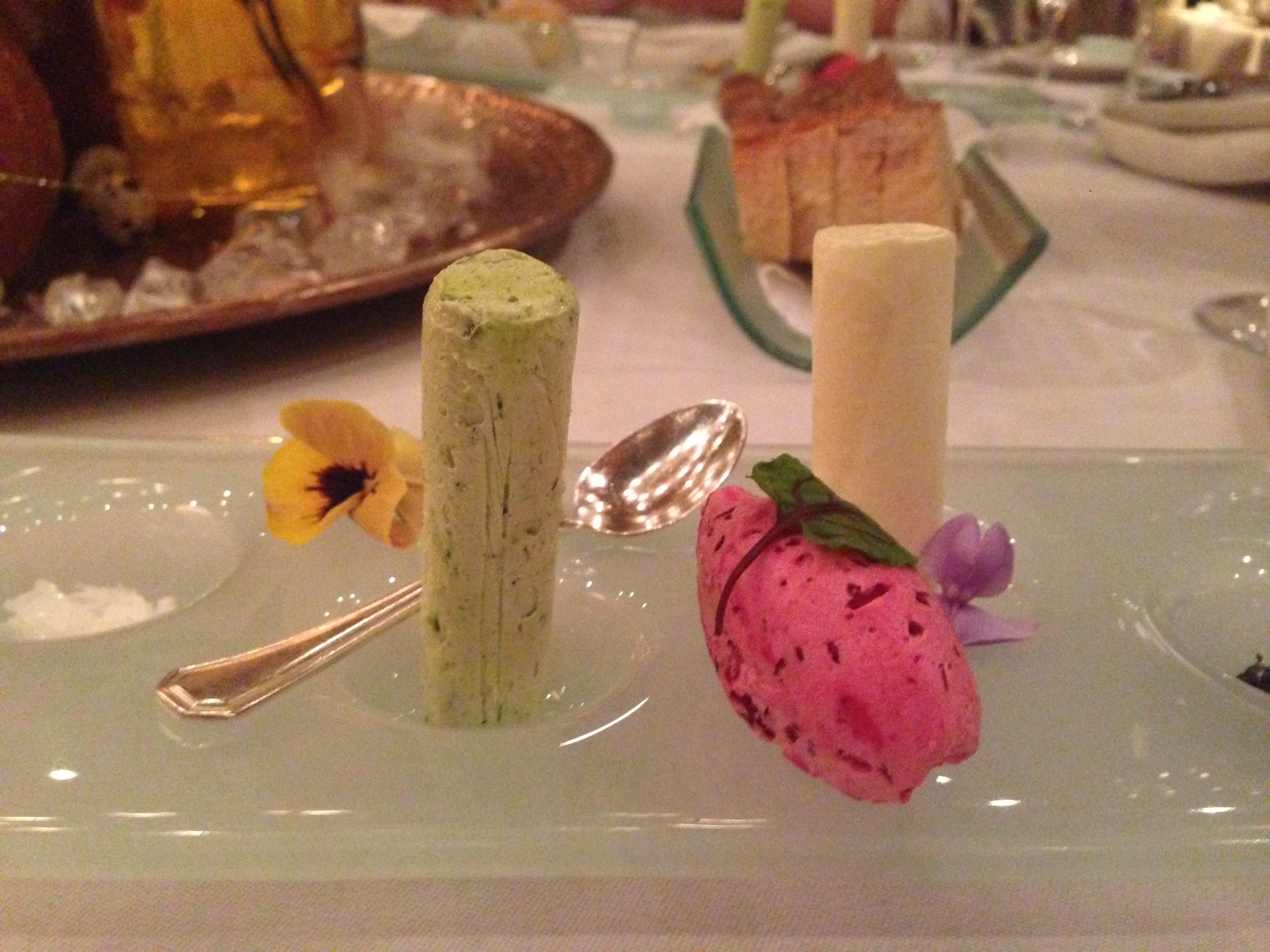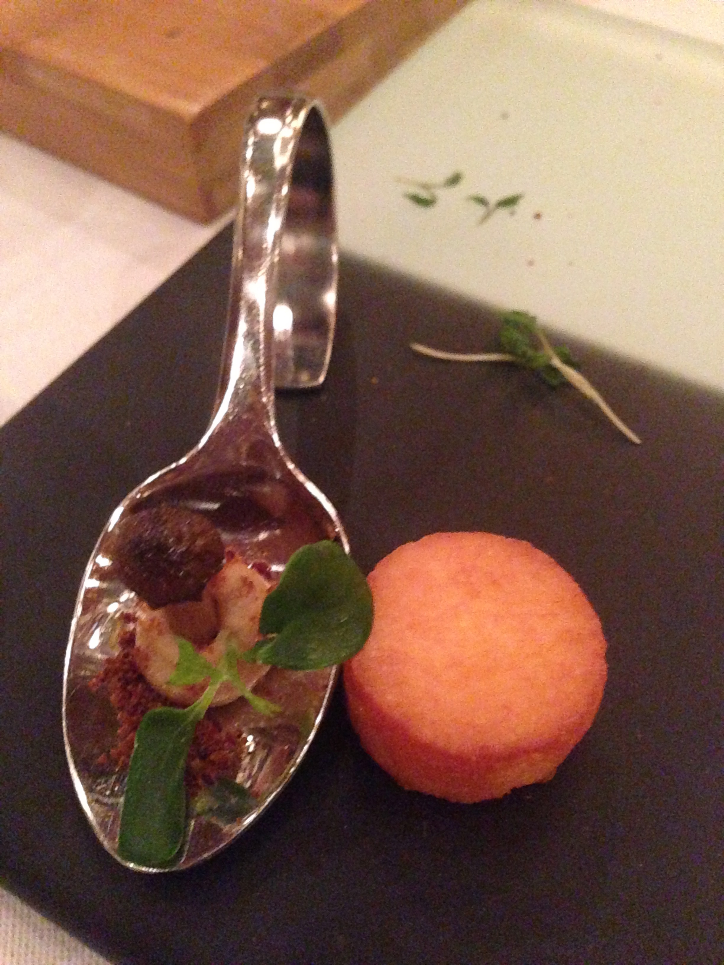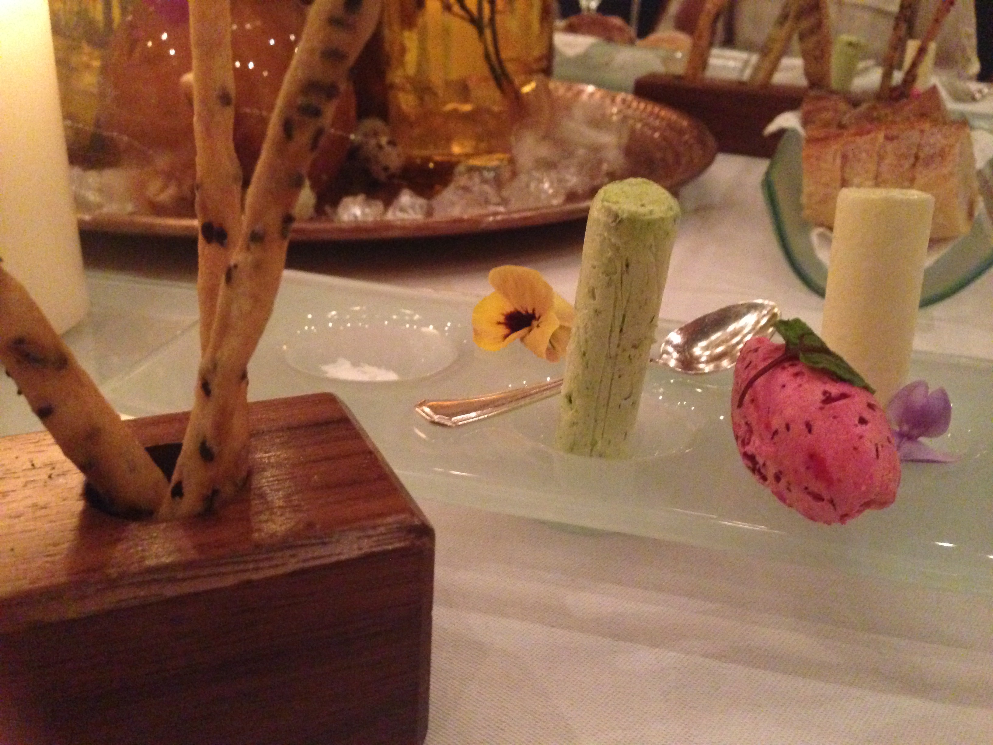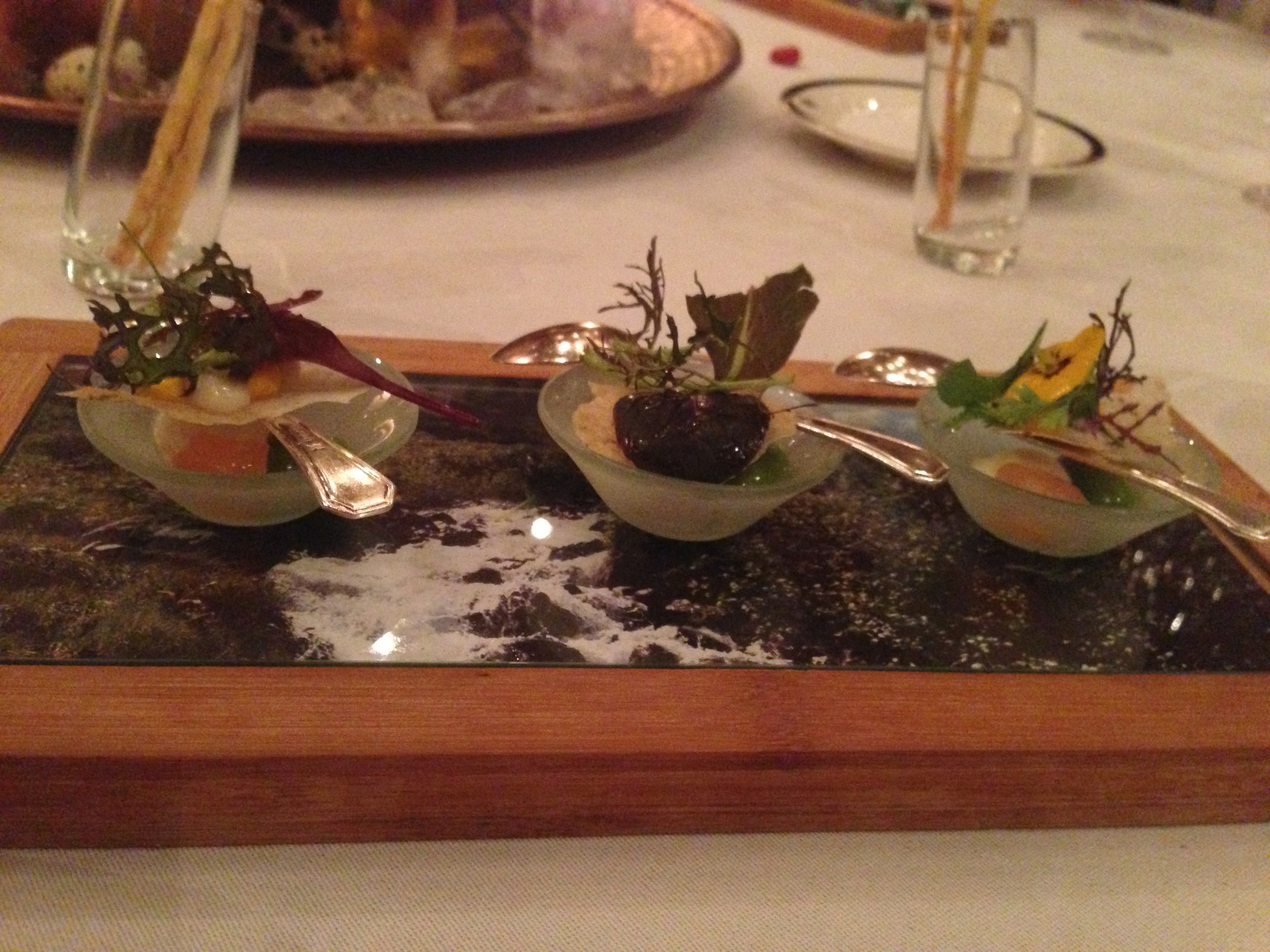 בערבים אכלנו פעם אחת במלון (בערב ההגעה), פעם אחת במסעדה מסורתית עתיקה שבנויה בתוך בית טירולי עתיק, פעם הוזמנו לערב פונדו, ובערב האחרון נלקחנו לארוחת ערב מושקעת במיוחד במסעדה שנחשבת לאחת הטובות באוסטריה ומגישה ארוחה של 13 מנות עם שישה סוגי יין שונים. הארוחה הזו נמשכה 4.5 שעות והייתה שווה ממש (אני מניחה שהיא גם יקרה ממש). הנה חלק מהמנות בארוחת הערב האחרונה: