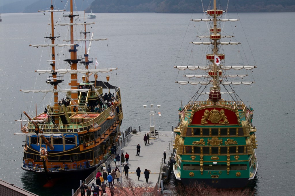 הספינה שבה שטים ממש יפה ואפילו יש בה תאי מחלקה ראשונה. מאחר שמדובר בשיט של כ-20 דקות בכלל לא העלנו בדעתנו לקנות כרטיסים למחלקה הראשונה, ורק כשכבר היינו על הספינה גילינו שכל החלק האחורי שלה הוא המחלקה הראשונה. למה זה משנה? כי הר פוג'י נמצא בכיון ההפוך מזה שאליו מפליגים, מה שאומר שלמי שמאחור יש נקודת תצפית הרבה יותר טובה. במקרה שלנו זה לא באמת היה משנה כי היה מעונן ולא ראו כלום. כל כך מעונן היה שאי אפשר היה אפילו לנחש איפה ההר בלי מפה. לזכותם של היפנים – ההגונים והמאורגנים לעילא ולעילא – לפני העלייה לספינה יש שלט שמעדכן בכל יום מה הסיכוי לראות את הר הפוג'י. ביום שאנחנו ביקרנו הופיע איקס גדול על סמל ההר. אבל כאמור, היינו חייבים לנסות.