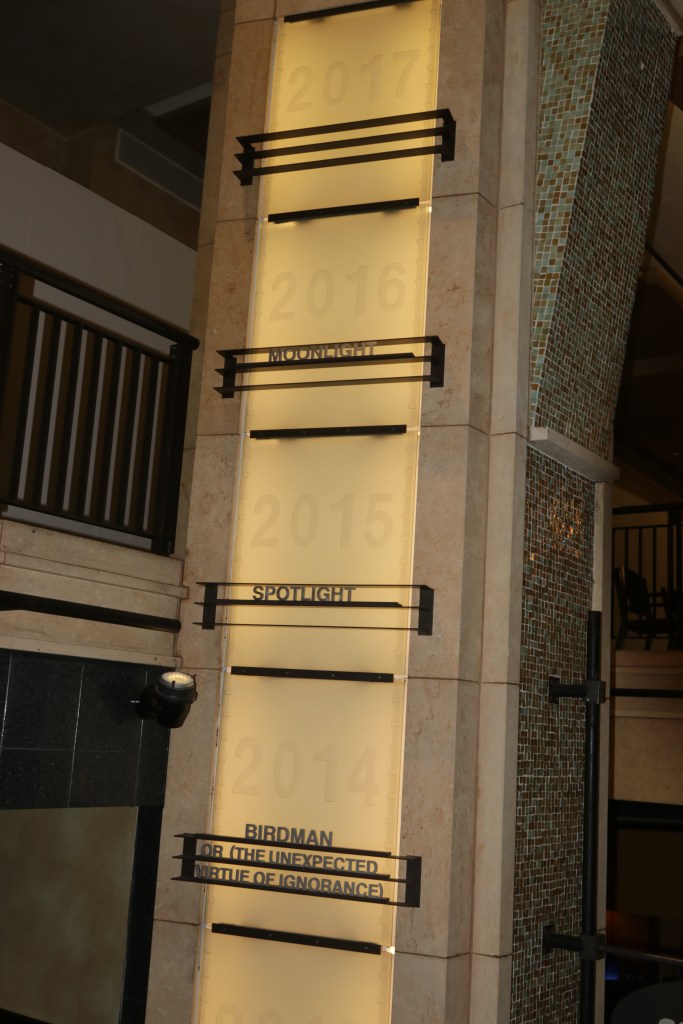 אחרי הליכה של כחצי שעה בשדרות הוליווד, מחפשים כוכבים מוכרים, הגענו לתיאטרון שבו נערך טקס האוסקר. מתברר שהוא נמצא בראש גרם מדרגות שלפניו שדרת חנויות, אבל בטקסים תמיד רואים את הכוכבים פוסעים שם על השטיח האדום ואין זכר לחנויות (בטח מכסים אותן, חייבת לבדוק את זה בטקס הבא). בשדרת החנויות הזאת יש עמודים שעליהם מתועדים כל הסרטים ששזכו באוסקר, וזה למעשה הדבר היחיד שמבדיל את התיאטרון הזה מכל מקום אחר. ככה זה נראה: