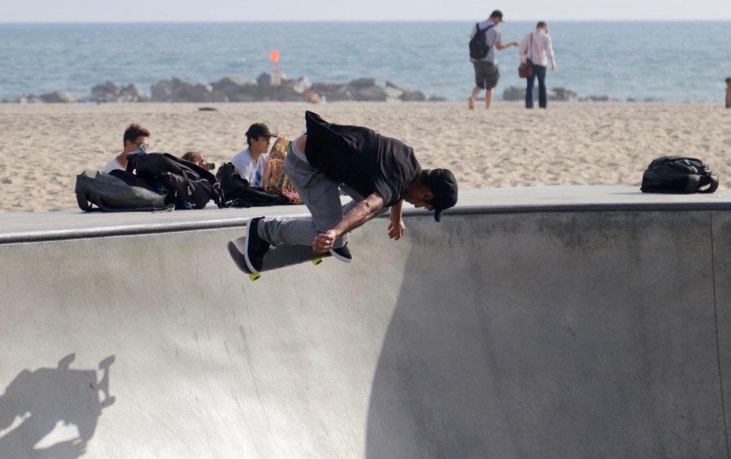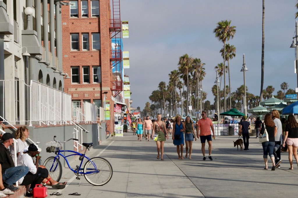 אחרי שהגענו למלון והתקלחנו היינו חייבים לצאת שוב, כדי לא להירדם ולהיתקע לגמרי את הג‘ט לג. אז נסענו ל-Venice Beach. איתמר וגיא היו הרוגים ורצו להרוג אותנו, אבל ידענו שזה לטובתם. אז הלכנו לאורך הטיילת עד סנטה מוניקה והיה מקסים ממש. אווירת חופש מהממת. בדרך ראינו רוכבי סקייטבורד עושים פעלולים, בודי בילדרים מתאמנים ומלא אנשים יפים ושזופים.