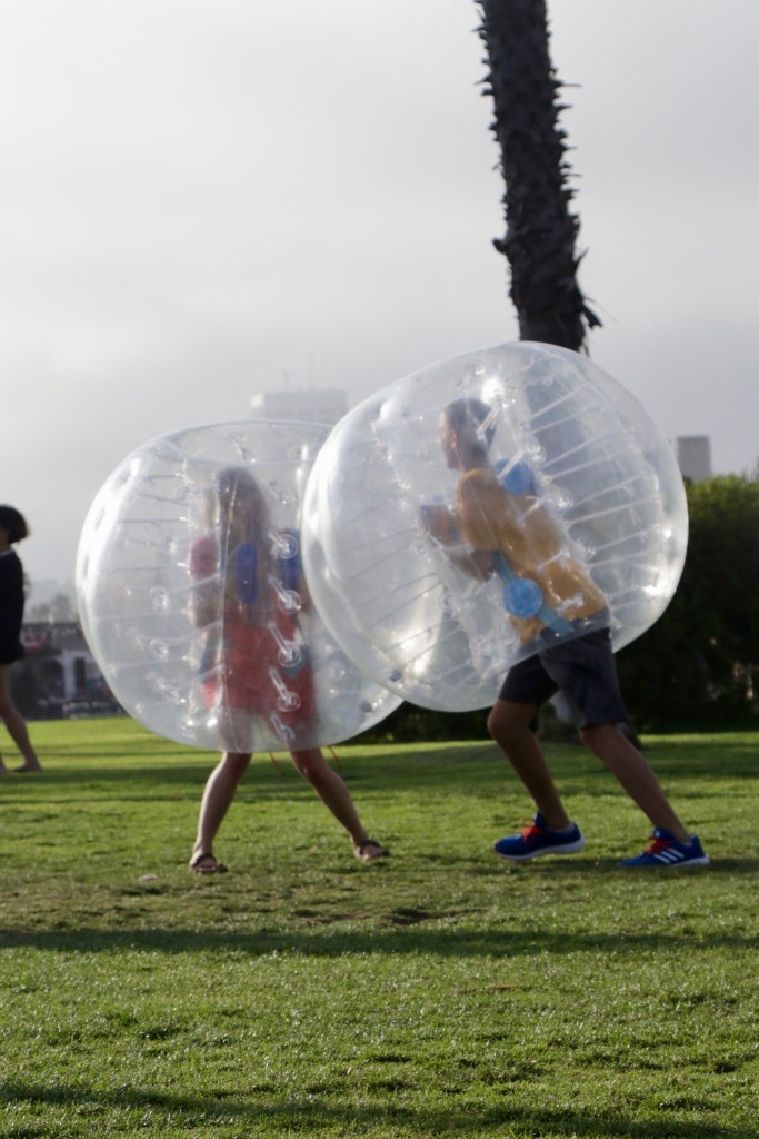 אלון אמר שזה הליכה של חצי שעה אבל זה לקח שעתיים. למרבה המזל, הילדים מצאו בדרך מקום שאפשר לשחק בו בכדורים מתנפחים, ותוך דקה שכחו שהם עייפים. הוראות המשחק פשוטות: לובשים כדור כזה ואז דוחפים את כל האחרים הכי חזק שאפשר. מעיפים אחד את השני וככל שנופלים יותר חזק זה יותר כיף כי הכדור בולם את כל הנפילות.