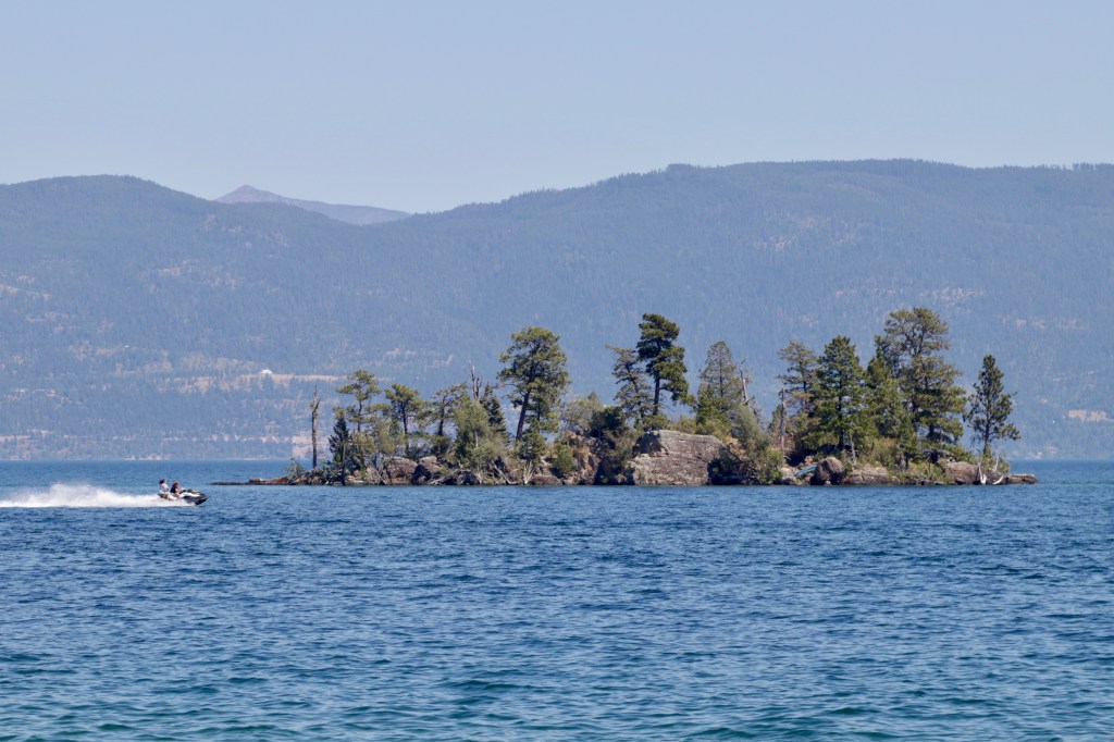 בצהריים הגענו ל-Flathead Lake שהוא אגם גדול במערב מונטנה. האגם מקסים, ומאחר שבחוץ היה חם נורא והמים היו נעימים מאוד, החלפנו מיד לבגדי ים וקפצנו פנימה (יש יתרון בזה שכל הציוד שלנו כל הזמן איתנו).