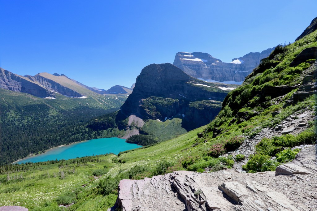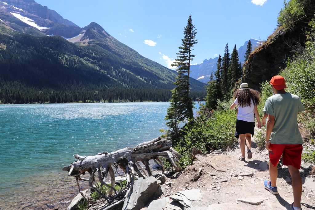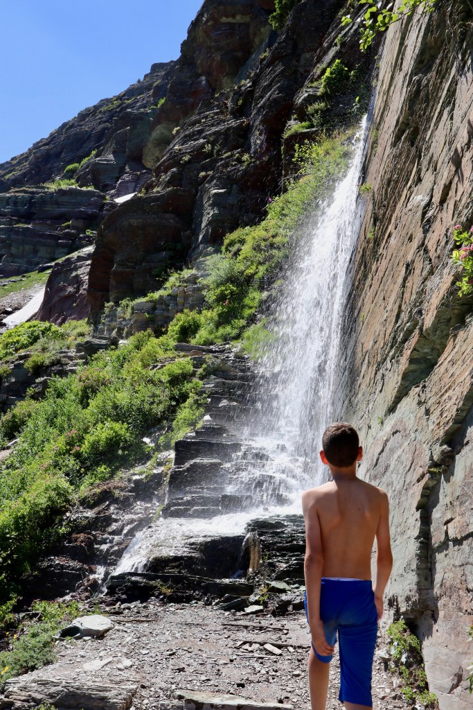 משם המשכנו בכביש למסלול השני שתכננת לנו לאותו יום – Grinell Glacier. מה אני אגיד לכם, כנראה שהמשפחה שלנו לא יכולה לעשות מסלול בלי לטעות (ע"ע הפארק הלאומי שננדואה לפני שנתיים). אבל הפעם הטעות הייתה כולה שלי. קראתי שהמסלול הוא 6 מייל – 9.5 ק"מ – וחשבתי לעצמי שזה סביר בשבילנו. מה שלא קראתי היה שזה 9.5 ק"מ לכל כיוון. ושזה בעלייה. ושאנחנו עושים את זה באמצע היום, כלומר בשעות הכי חמות.