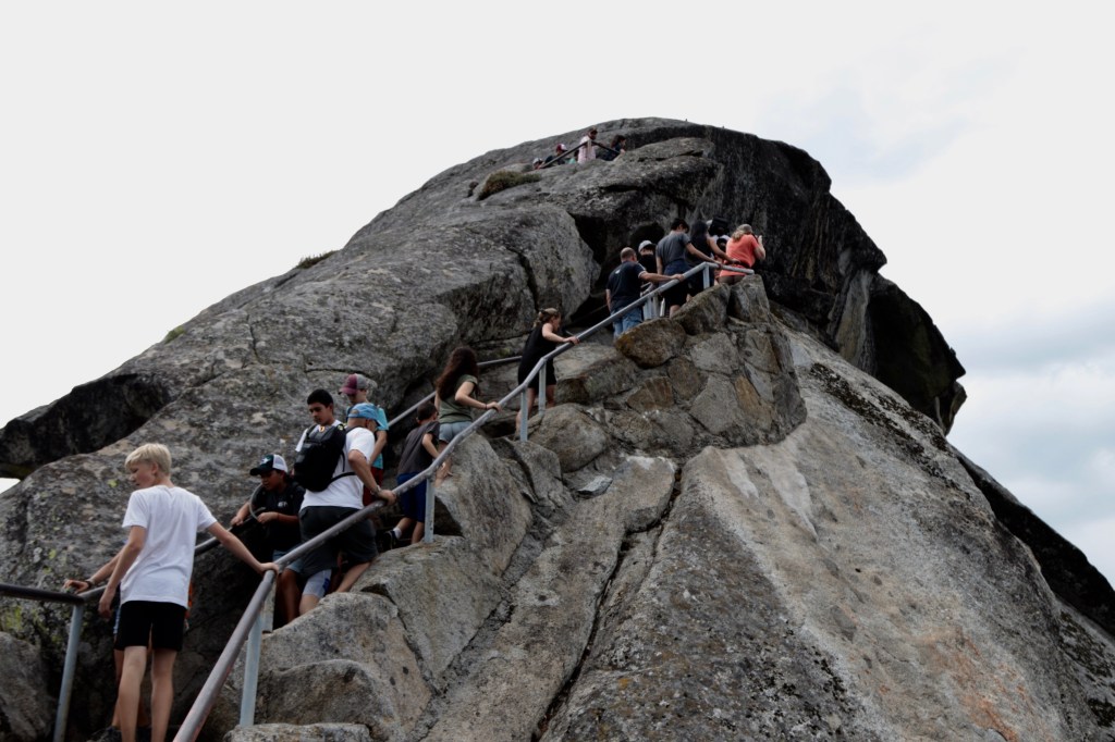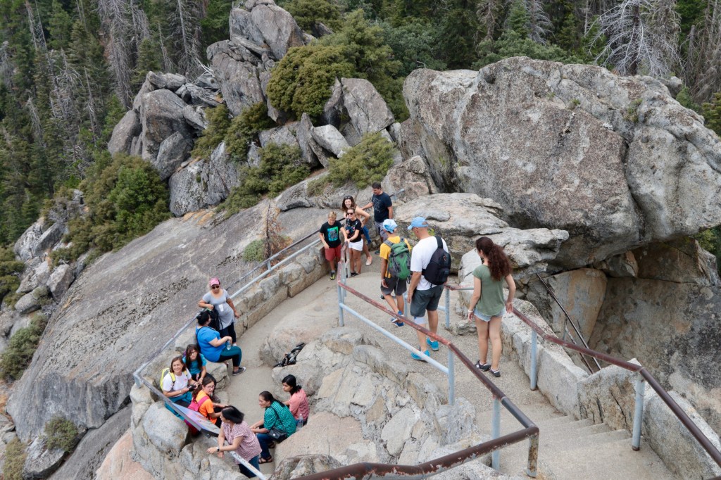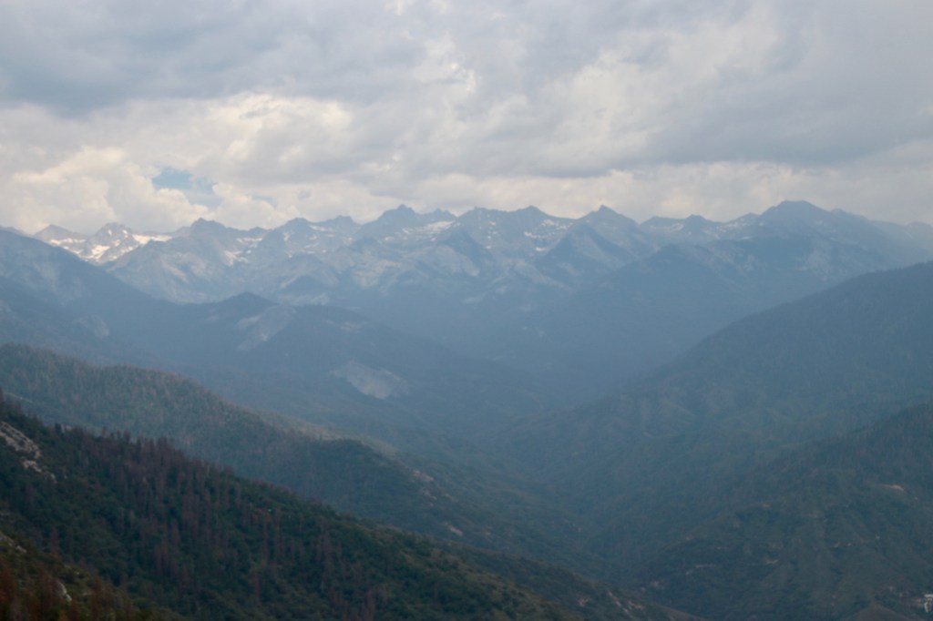 היעד הבא שלנו היה ה-Moro Rock – גוש גרניט עצום וחשוף באמצע הפארק המתנשא לגובה 2,200 מטר, ואפשר לטפס ב-350 מדרגות עד לפיסגה שלו ולראות את כל הרי הסיירה נבאדה לרגליך. הטיפוס לא נורא קשה (גם אחרי עשרת אלפים המבורגרים שאכלנו פה) והפיסגה מתגמלת בהחלט. מאוד יפה שם למעלה, ויש גם אזהרה שהמקום ממש מסוכן כשיש ברקים כי אפשר להיפגע מאחד, ולכן יש שורה של סימנים שאם הם מתחילים כדאי לברוח מהר לאוטו. אחד מהם הוא אם נהיה מעונן. ובכן, בשנייה שירדנו לאוטו ונכנסנו לאוטו התחיל מבול מהסרטים… זה לא היה כתוב בשום תחזית, וממש ריחמנו על מי שנתקע בפסגת הצוק בגשם.