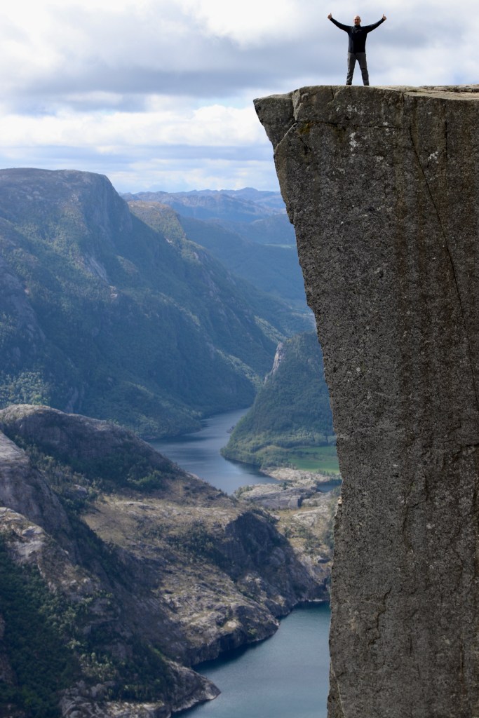 יצאנו קצת אחרי 8 בבוקר וב-10 כבר היינו על הצוק. ואיזו תחושה מדהימה זו הייתה. הגובה מהמם והמרחב הפתוח של הפיורד גורם לך לרצות לעוף. כולם רוצים להצטלם ממש בשפיץ של המצוק ויש תור של אנשים. בצד השני יש איזו נקודה ממול שכל הצלמים נעמדים עליה גם הם בתור, כל אחד לפי המקום של הבן זוג שלו בתור השני, וזה ממש מצחיק.