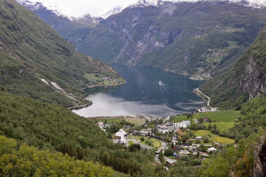 אחרי שניסינו לזרוק אבנים לאגם הקפוא ולנסות לשבור את הקרח, ואחרי שהתפעלנו מהשלג שנערם לצד הדרך והגיע לגובה של יותר משלושה (!) מטרים, המשכנו בנסיעה. יצא שהגענו ל-Geiranger מלמעלה במקום דרך הפיורד, וכך הרווחנו גם כמה תצפיות ממש יפות על העיר כמו זו: