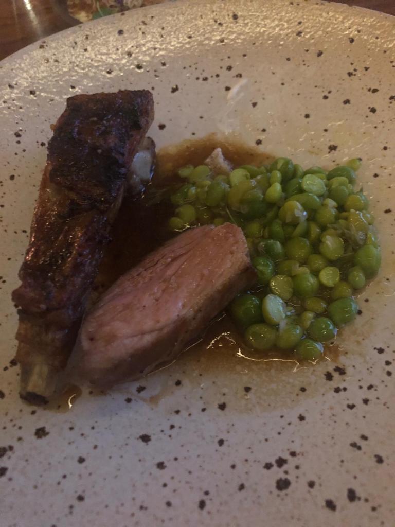 צלע וסינטה של טלה עם אפונים, יוגורט טורקי וצ'יפס שעורה (שלא בתמונה)