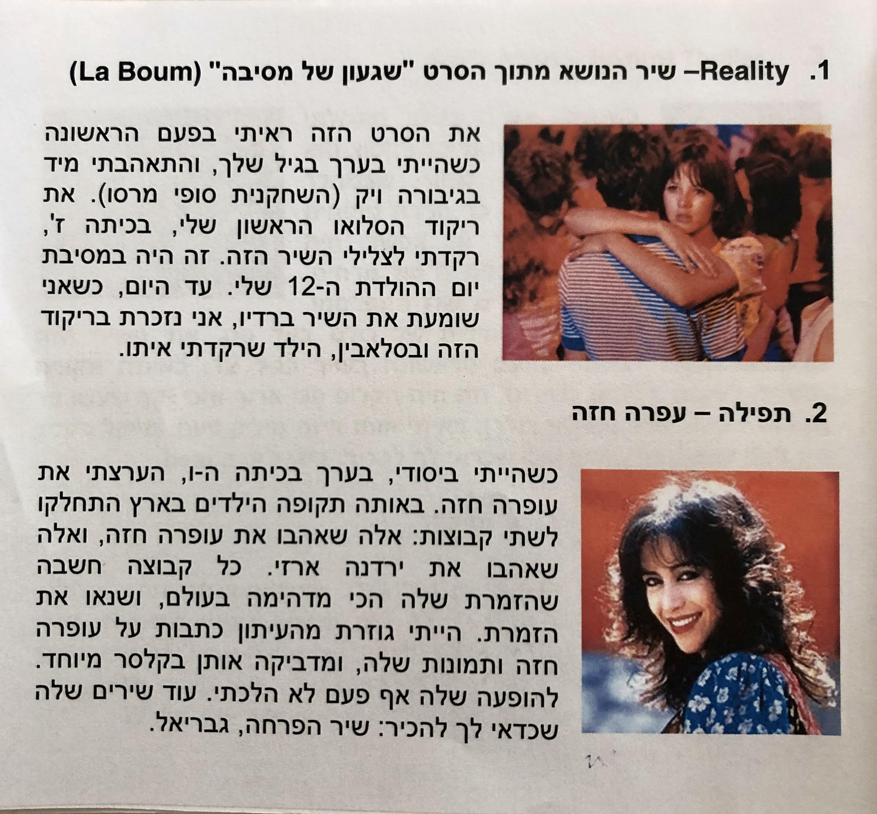 בפלייליסט שלי היו שירים כמו la boum (שהיה הסלואו הראשון שלי), Thriller של מייקל ג'קסון (שהערצתי כשהייתי בגיל שלו והיה אחד הווידאו קליפים הראשונים שראיתי בMTV), דני רובס (ששמעתי בווקמן בדרך חזרה מהטירונות תוך כדי בכי מטורף על זה שנוסעים ישר לבסיס החדש ולא חוזרים הביתה) וגם עופרה חזה ו-hotel california. בדיסק של אלון היו שירים כמו "את לא כמו כולם" של משינה (שיר החתונה שלנו), שמוליק קראוס (שהוא שמע בקסטות בטרקים במזרח) נורית גלרון, בנזין, דיויד בואי ואלן פארסונס.
