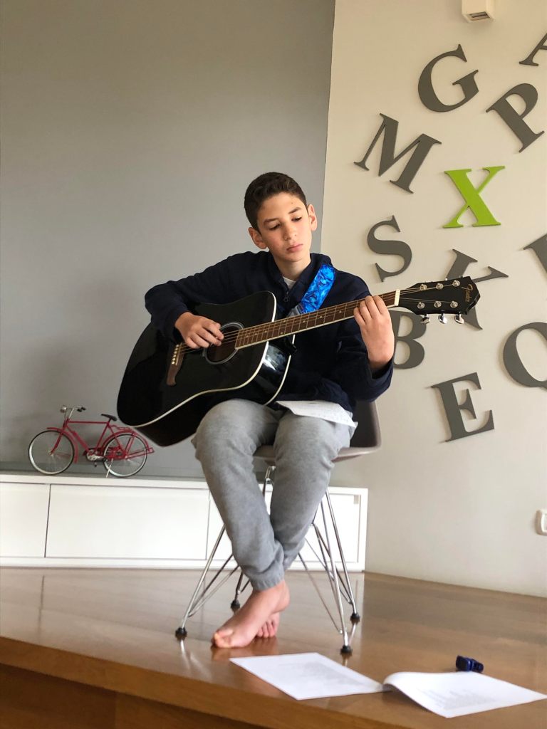 ובחזרה לחודש משפחה. המשימה הראשונה שגיא קיבל במסגרת החודש הייתה לארגן קונצרט גיטרה למשפחה המורחבת. הוא היה צריך לבחור את השירים שינגן, להזמין את האורחים ולהכין שירונים. אנחנו צירפנו לזה ארוחת צהריים. בסוף יצא שאת השירונים אני הכנתי, אבל את כל השאר הוא עשה.