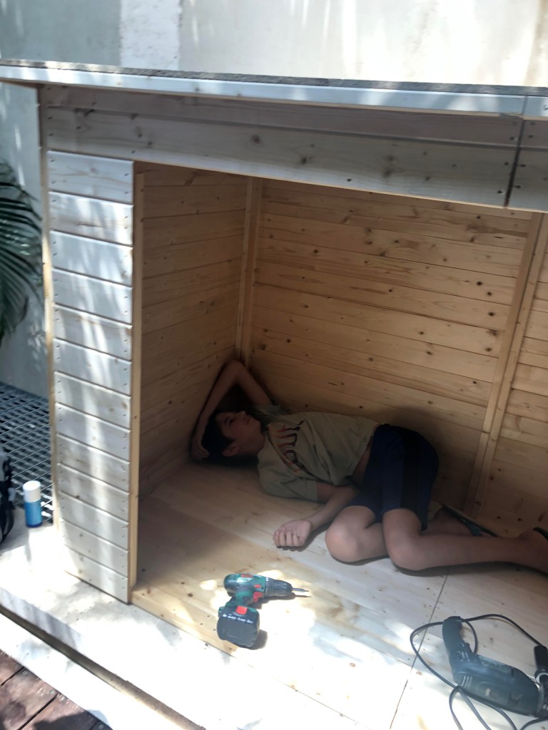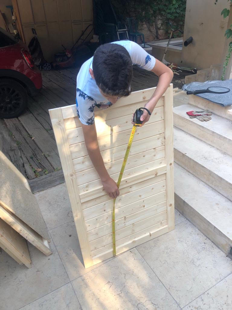 מלאכה נוספת שגיא התנסה בה החודש הייתה בניית מחסן. יצא שקנינו מחסן מעץ לחצר, כזה שבונים בהרכבה עצמית, וגיא עזר לאלון להרכיב אותו. הוא למד איך לסדר את החלקים, להסתכל בשרטוט, לדפוק בפטיש וכל שאר הדברים שכרוכים בבניית מחסן. כשחושבים על זה, זה די כמו לבנות בלגו, ובזה הוא תמיד היה מעולה.