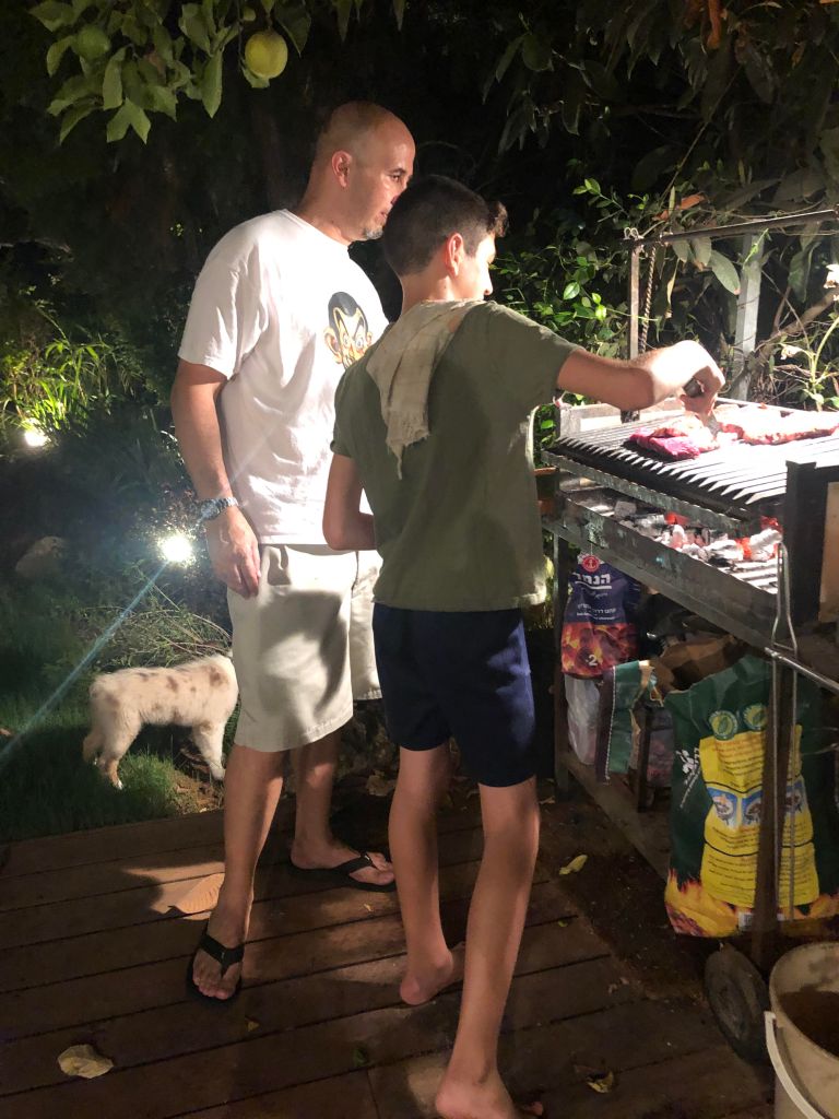 באחד מסופי השבוע אלון לימד אותו גם לעשות מנגל. גם איתמר למד את המלאכה הזו בשנת הבר מצווה שלו, ויש לציין שזו אחת המלאכות שהוא מתמיד בהן עד היום (בשונה למשל מהחלפת פנצ'ר שחוץ מהלימוד התאורטי עוד לא יצא לו התנסות מעשית, תודה לאל). איתמר מאוד שמח שגיא ילמד גם להכין את הפחמים, להדליק ולצלות את הבשר (מסיבות אידאולוגיות אין אצלנו כניסה למנגל גז, רק פחמים) ויחלוק איתו בנטל:) גיא, שחשב שלעשות מנגל אומר לזרוק את הבשר על האש ואחרי כמה דקות להוריד, די הופתע מכמות העבודה שכרוכה בעסק הזה.