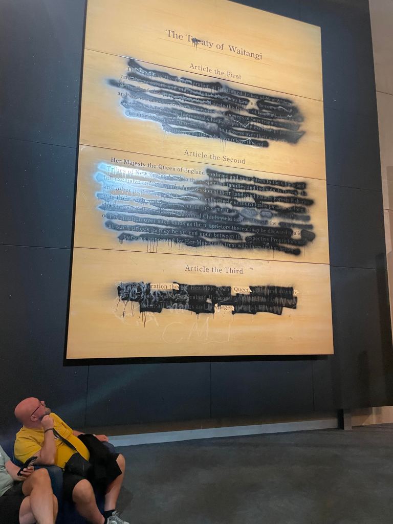 כל הסיפור הזה מוצג בצורה מאוד מכובסת במוזיאון (המדריך בסיור קרא לתרגיל שעשו למאורים "lost in translation". ממש…). אבל מתברר שהמחלוקת והכעס סביב ההסכם קיימים עד היום, ורק לפני חודשיים מישהו נכנס למוזיאון וריסס בצבע שחור את הנוסח האנגלי של הסכם וויטאנגי. רק כשראיתי את הדבר הזה נכנסתי לגוגל לקרוא קצת וגיליתי מה עומד מאחורי המעשה.