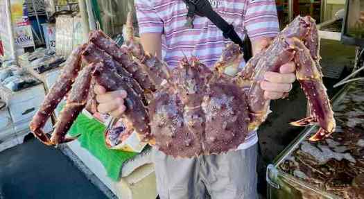 קודם כל הלכנו לשוק הדגים ופירות הים (Morning market) כי הוא נסגר ב-14:00. הסתובבנו בין הדוכנים, ראינו סרטני ענק וגם אכלנו צהריים קליל ב-food court שיש שם. המאכל הלאומי של הוקאידו, שיש אותו בכל מקום, הוא Donburi (באנגלית Rice bowl). אלה קערות אורז שמעליהן עורמים פה סוגים שונים של פירות ים לפי הזמנה – מטונה וסלמון דרך צדפות וסרטנים ועד קיפודים וביצי דגים. זה נראה צבעוני ויפה, אבל לא משך אותנו לנסות, כי את רוב פירות הים שהם שמים בקערה לא רצינו לאכול, ומה שכן רצינו אפשר לקנות כסשימי ולא צריך את קערת האורז. במקום זה ניסינו רגל של King Crab שהייתה עשירה בבשר וטעימה מאוד. באופן מפתיע גם לא היה צריך לעבוד קשה כדי לחלץ את הבשר מהשריון.