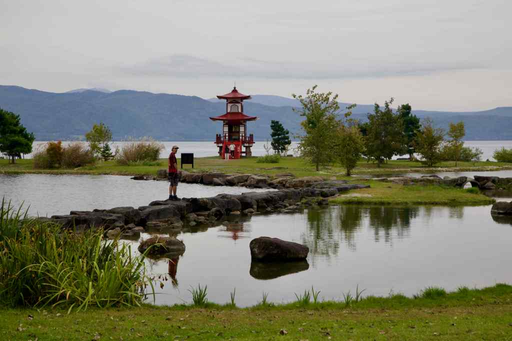 בדרך חזרה הקפנו ברכב את Lake Toya, שבאינטרנט המליצו עליו כמסלול יפה שצופה על האגם. ובכן, הכביש אכן יפה אבל בצד של האגם יש סבך עצים שלא מאפשר לראות את האגם עצמו, למעט בחרכים מדי פעם. המקום היחיד שבו אפשר לראות את האגם (חוץ מהאיזור של המלונות) הוא Ukimido, שם יש פארק קטן ויפה עם פגודה סימבולית.